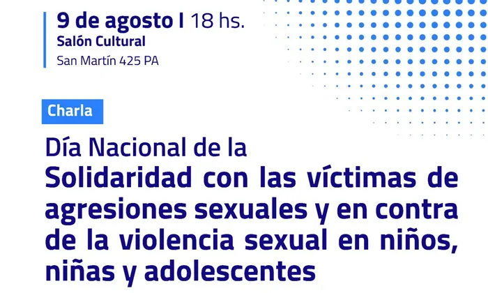 La Municipalidad de Azul recuerda que este miércoles 9 a las 18, en el Salón Cultural - San Martín 425- , se realizará una charla en el marco del Día Nacional de la Solidaridad con las víctimas de agresiones sexuales y en contra de la violencia sexual en niños, niñas y adolescentes.